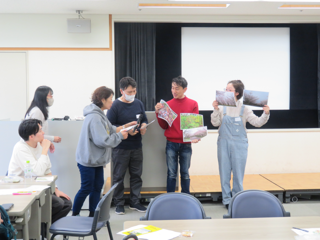 お天気が良ければ皆さんでお花見をして終了する予定でしたが、お天気が不安定のためもう一度室内に戻り、ビンゴで見つけた場所の写真をそれぞれの班で発表しました。「そんな場所があったんだ〜!」と何度か青葉の森を訪れている方も新たな発見があったそうです💡